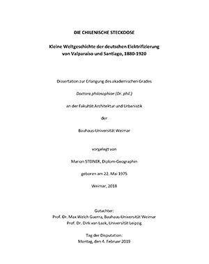 Tomando como ejemplo la electrificación de dos grandes ciudades en la costa oeste de Sudamérica, la tesis muestra la influencia global de actores industriales y financieros alemanes en el desarrollo técnico, urbano y sociocultural en el apogeo del imperialismo europeo. De esta manera, las historias regionales del centro urbano de Chile y la Electrópolis Berlín se unen para formar una historia global. El análisis se centra en las redes mundiales de actores y las relaciones de poder, así como en el patrimonio cultural y su interpretación actual.